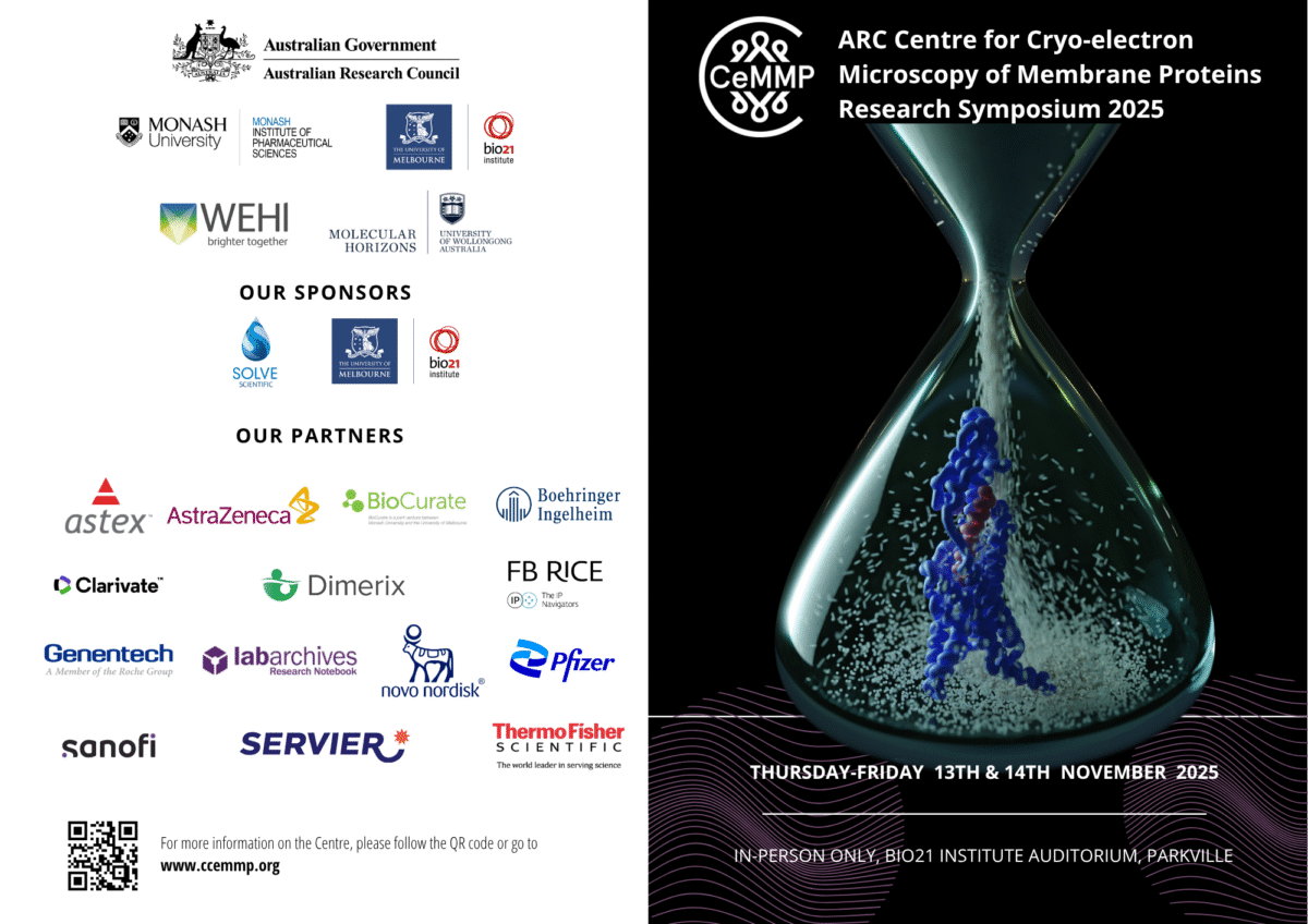 The Australian Research Council funded Centre, Centre for Cryo-electron Microscopy of Membrane Proteins (CCeMMP), is hosting a free in-person 2025 Research Symposium to showcase the exciting research and technological advances in the field of cryo-electron microscopy and membrane proteins and will feature two keynote presentations. CCeMMP invite the scientific community to attend and participate in the symposium on the 13th and 14th of November in Melbourne, Australia.
