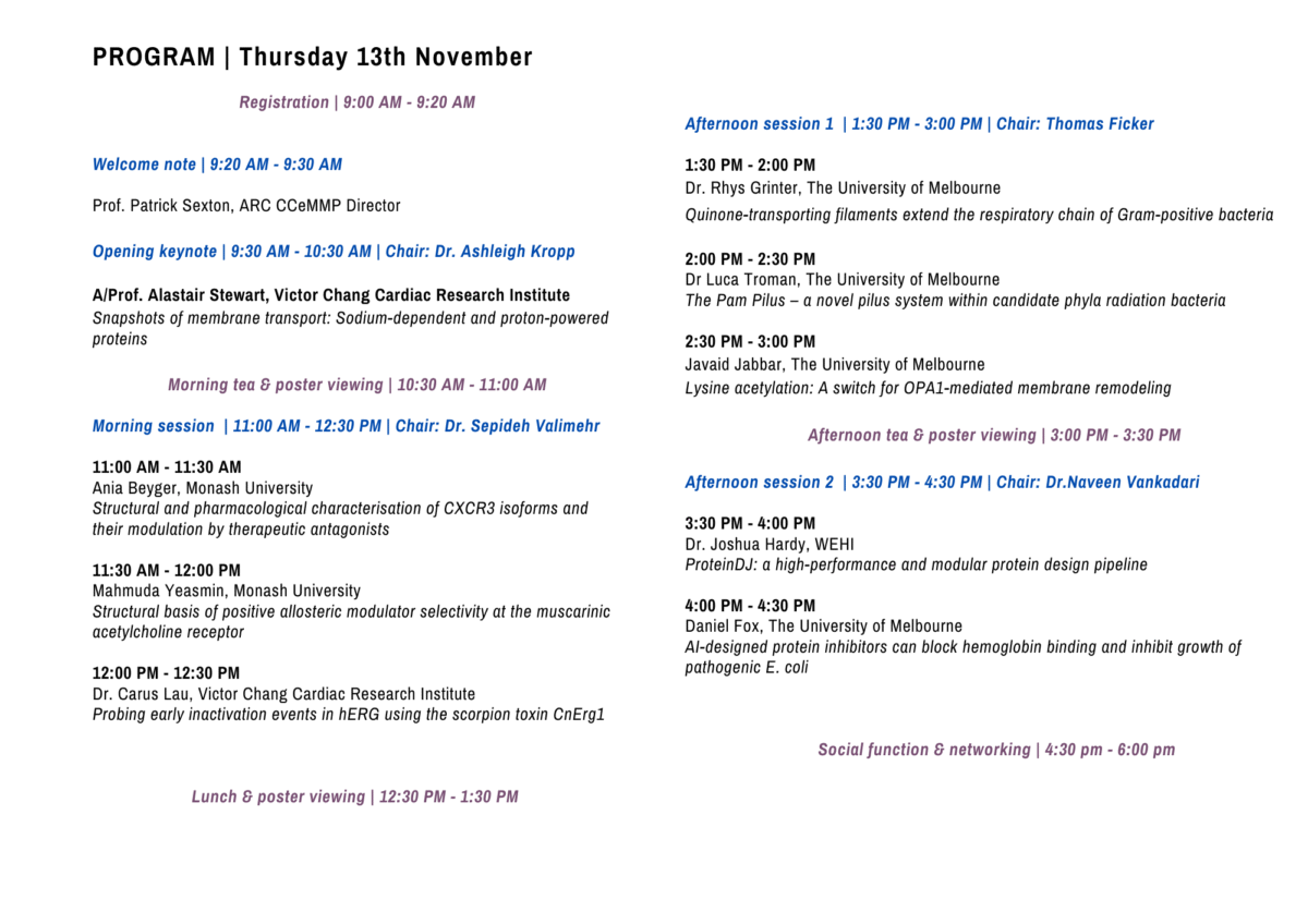 The Australian Research Council funded Centre, Centre for Cryo-electron Microscopy of Membrane Proteins (CCeMMP), is hosting a free in-person 2025 Research Symposium to showcase the exciting research and technological advances in the field of cryo-electron microscopy and membrane proteins and will feature two keynote presentations. CCeMMP invite the scientific community to attend and participate in the symposium on the 13th and 14th of November in Melbourne, Australia.