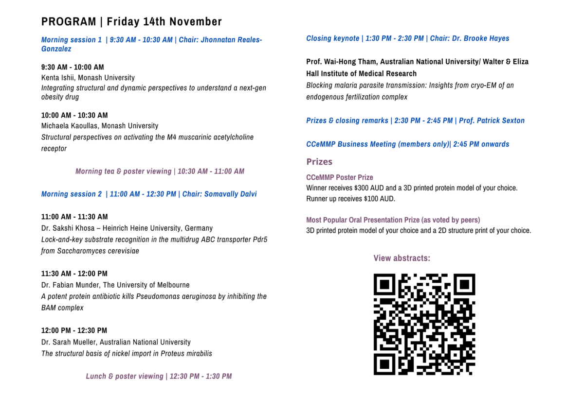 - CCeMMP Poster Prize – $300 AUD and a 3D printed protein model of your choice